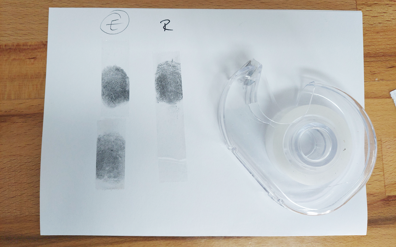 Schritt 4: Nimm das Klebeband vom Finger ab und klebe es auf ein weißes, unliniertes Blatt Papier. Du wirst deinen Fingerabdruck sofort sehen können.