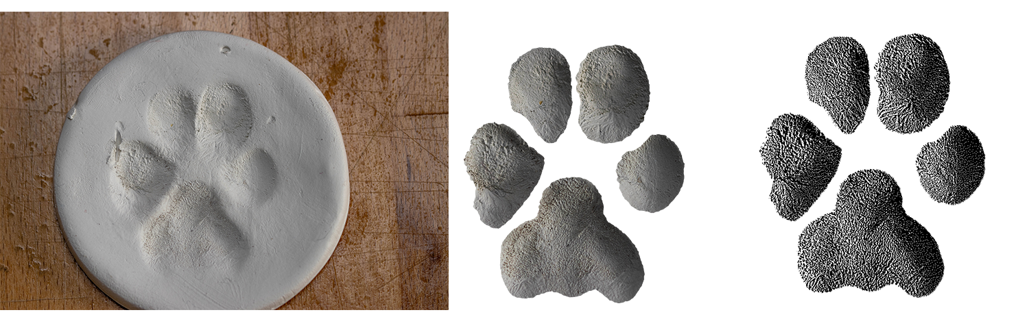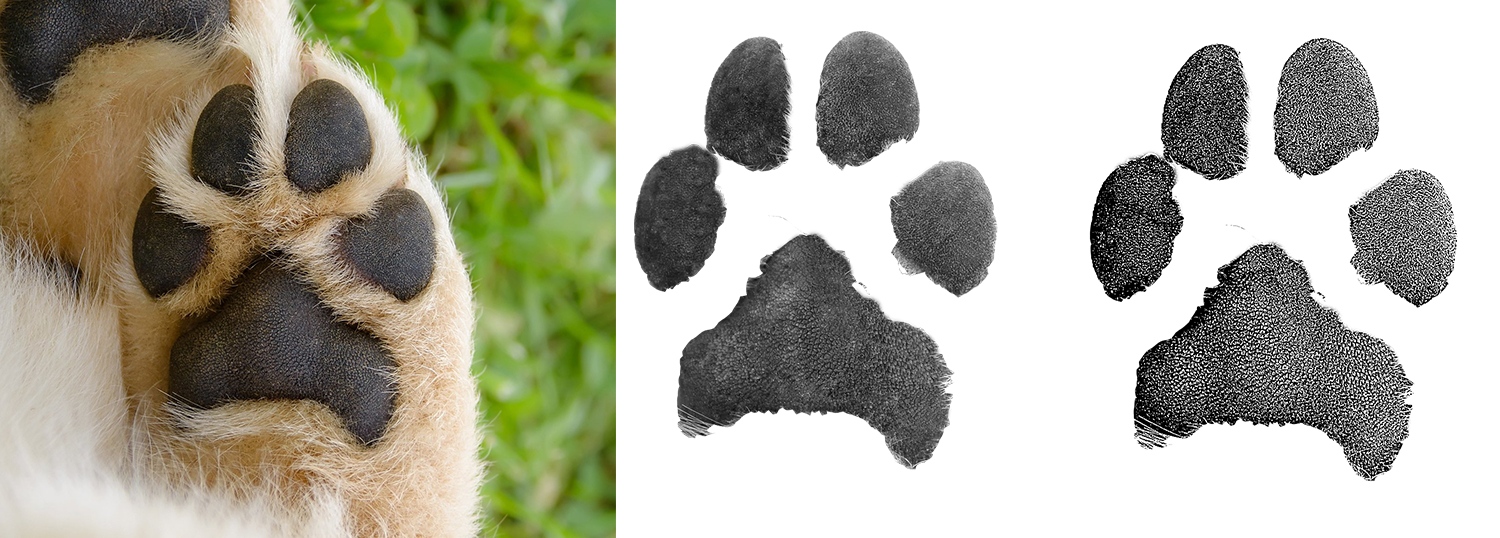Mach einfach ein Foto der Pfote deines Lieblings. Achte darauf, dass die Pfote sehr gut zu sehen ist. Sollten zu viele Haare am Ballen sein, entferne diese bitte vorab. Fotografiere bei Tageslicht und in einer direkten Linie. Je mehr du von der Seite fotografierst, desto verfälschter wird das Resultat. Wie bei den anderen Möglichkeiten, lade das Foto dann bei dem Artikel deiner Wahl hoch. Bei unserem "Muster" ist der Winkel gerade noch vertretbar für ein aussagekräftiges Endprodukt.
